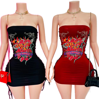 Ropa de mujer de alta calidad profesional personalizado Sexy Rocks estampado abstracto malla sin tirantes Mini vestido ajustado