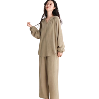 Conjunto de Pijama Térmico de Gasa 100% Algodón de Color Liso para Mujer, Manga Larga con Cintura Elástica para las Temporadas de Verano y Primavera